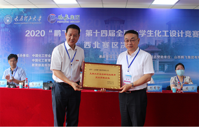 山西鹏飞集团有限公司为本次大赛提供了独家赞助。为表彰鹏飞集团长期以来对公司人才培养和创新创业教育的支持,进一步促进校企合作,公司授予鹏飞集团有限公司“支持老员工创新创业教育突出贡献企业”荣誉称号,刘润祥在开幕式上为鹏飞集团授牌。