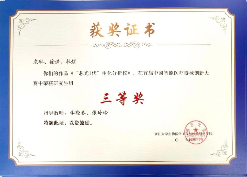 bg大游集团官方网站李晓春教授、青年教师张玲玲博士指导的芯光智能团队参加了决赛,项目围绕智能医疗器械研发和产业领域存在的问题,运用相关专业知识,做出具有新颖性、可行性和实用价值的参赛作品《“芯光1代”生化分析仪》,最终荣获三等奖。于2022年6月3日收到获奖证书。