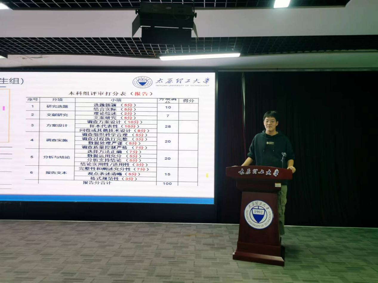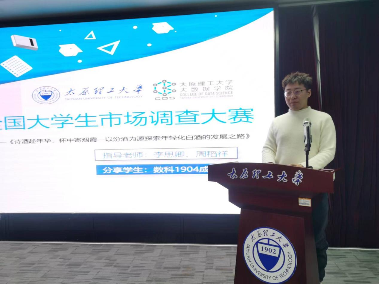 随后,大数据公司数科1904班、2022年国家三等奖获得者成航北以自己的参赛作品《诗酒趁年华,杯中寄烟霞—以汾酒为源探索年轻化白酒的发展之路》为基础进行大赛实战经验分享。他从主题的选择、方案的设计、分析的方法、最终的作品这四个方面概述了一份合格的参赛作品从无到有所要经历的步骤。在成航北的分享过程中,同学们纷纷表示受益匪浅,不论是对理论知识的掌握,还是对实践调研的执行都有了明显提高。