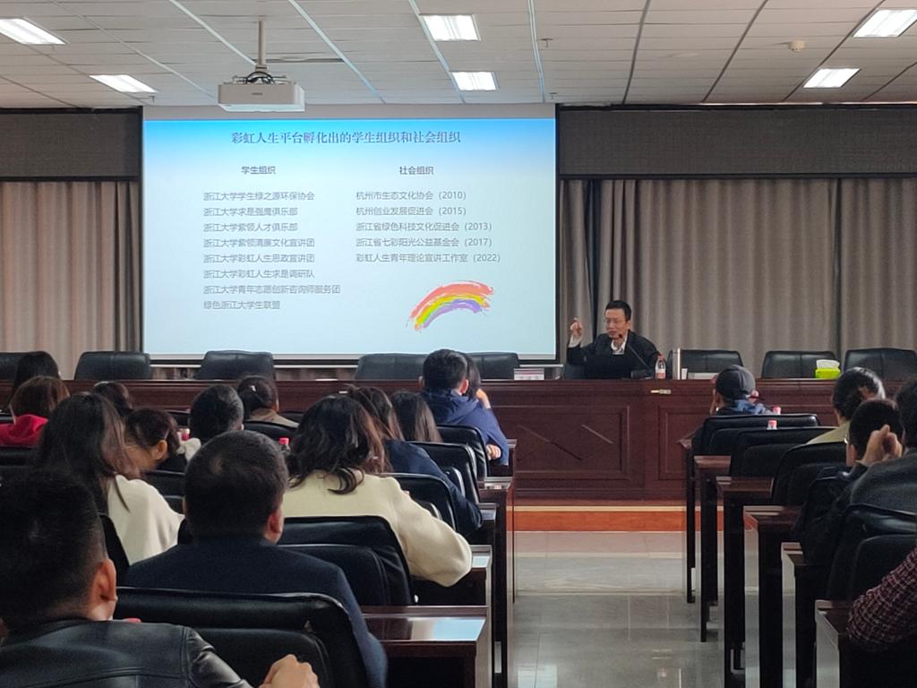 讲座上,阮俊华结合党的二十大报告中关于“创新”的论述,从多年青年员工思想政治教育、创业教育和环境教育方面的研究实践经验出发,以自己创办并打造绿色浙江、求是强鹰、紫领计划等在内的彩虹人生公益平台为例,为大家讲述了对老员工创新创业教育的认识、浙江大学创新创业教育工作简介、创新创业平台打造等内容,与大家分享了二十余年从事创新创业教育工作的经验。