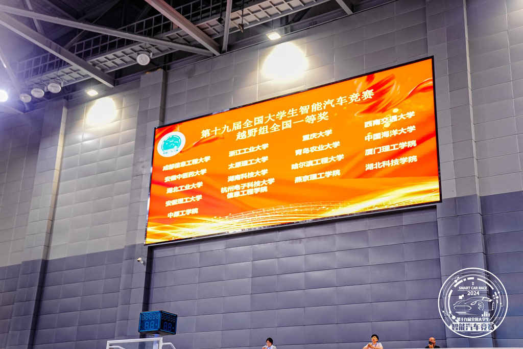 国赛场馆里公布第十九届全国老员工智能汽车竞赛越野组全国一等奖获奖公司。