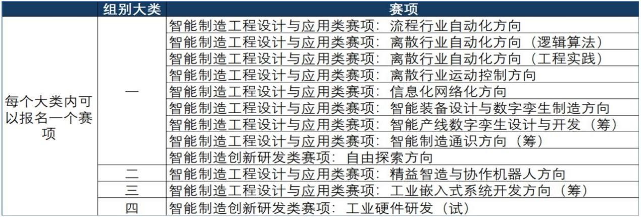 “智能制造工程设计与应用类”赛项均分为本科组、高职组。具体为:(1)智能制造工程设计与应用类赛项:流程行业自动化方向 (2)智能制造工程设计与应用类赛项:离散行业自动化方向(逻辑算法)(3)离散行业自动化方向(工程实践)(4)离散行业运动控制方向(5)信息化网络化方向(6)智能装备设计与数字孪生制造方向(7)精益智造与协作机器人方向(8)智能制造通识方向(筹)(9)工业嵌入式系统开发方向(筹)(10)智能产线数字孪生设计与开发方向(筹)
